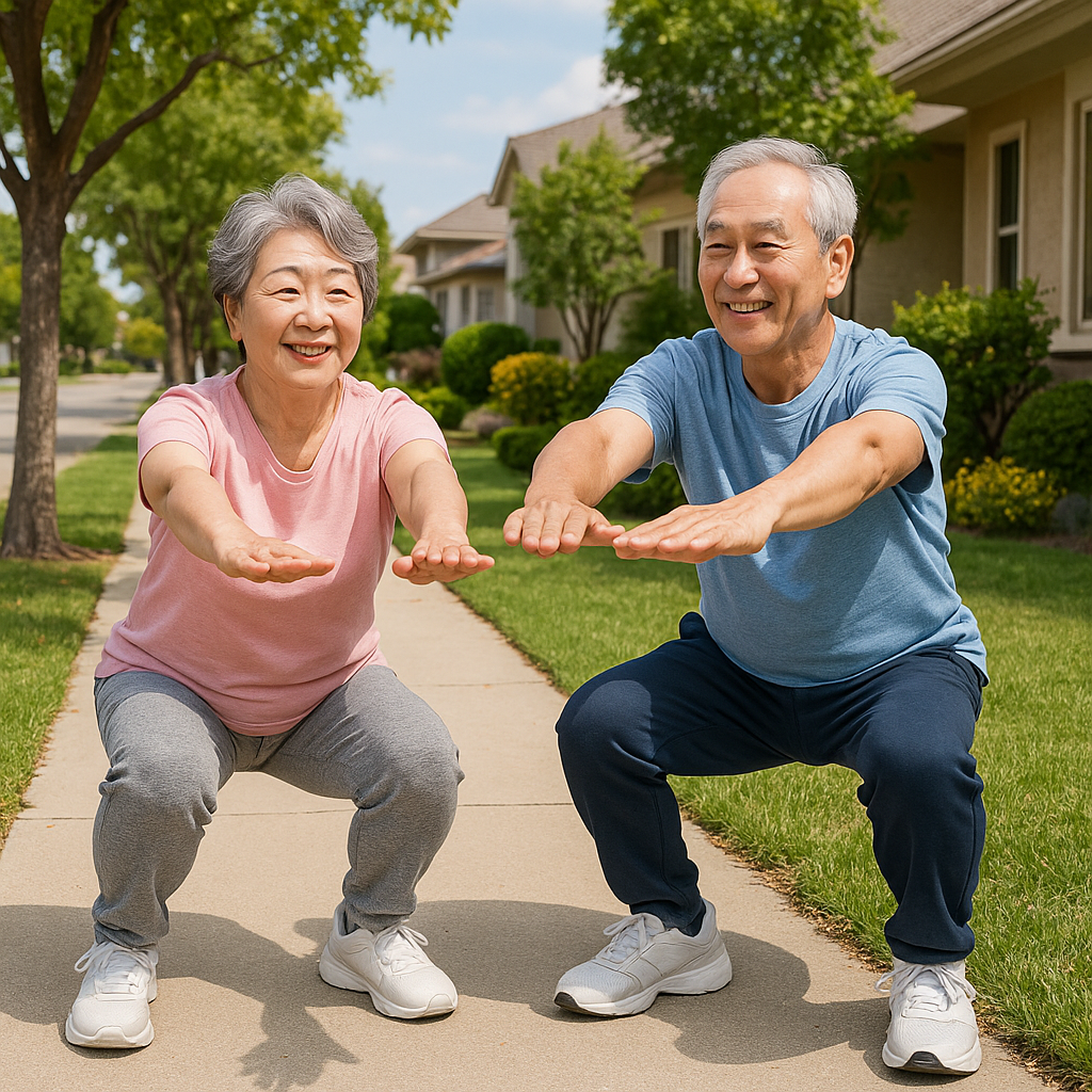- 스쿼트: 처음엔 의자 앞에서 앉았다 일어나는 동작 10회부터 시작해 보세요.